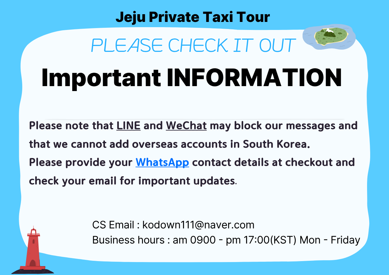 Pickup and drop-off from designated your hotel(jeju city downtown) Transport by private regular/jumbo/minivan taxi Jeju Taxi Tour Package, West Jeju Taxi Tour Basic English/Chinese speaking driver Fuel fees / Parking fees English speaking staff will coordinate this activity. Van / Mini Bus /Bus : Without luggage, A professional English/Chinese guide. The price of this product includes a VAT & Travel Agency Fee |